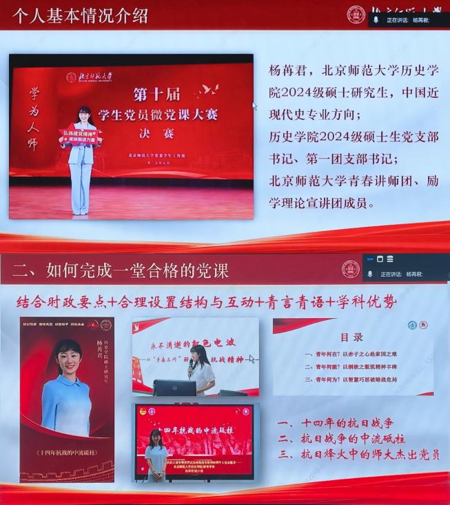 在精品黨課學習環(huán)節(jié),北師大“青春講師團”楊苒君講師講解微黨課《日記里的偉大建黨精神》,并分享紅色宣講實踐心得。她圍繞微黨課制作、合格黨課打造及黨課與主題黨日活動融合等核心內容傾囊相授,以其打造的黨課《十四年抗戰(zhàn)的中流砥柱》《永不消逝的紅色電波》,“宣講+紅色劇本殺”創(chuàng)新主題黨日活動為實踐案例,為紅色教育創(chuàng)新提供了鮮活范例。