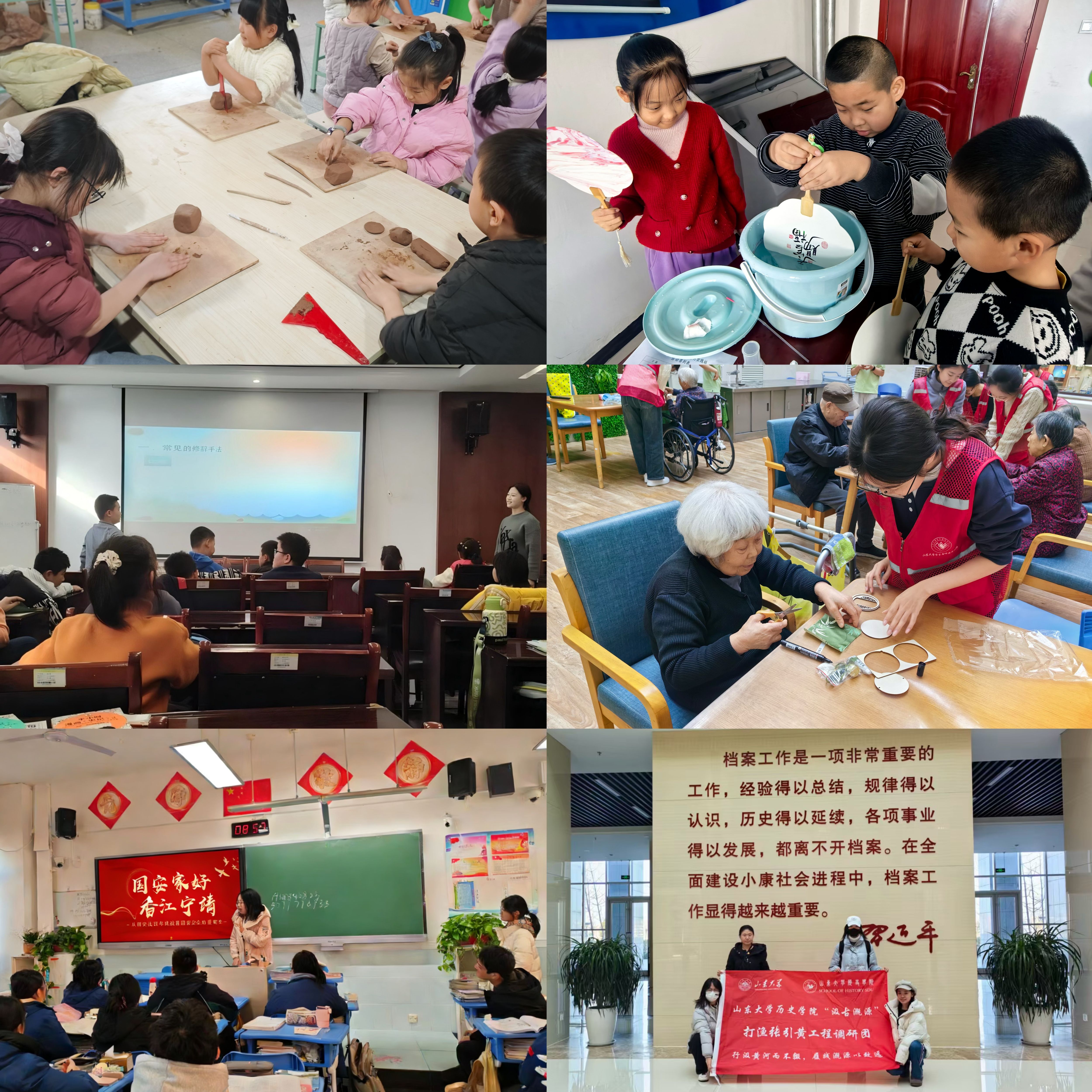 “小樹林鄉(xiāng)韻傳薪”實踐隊開展寒假公益支教,“東隅育蕾”支教隊打造“東悅?cè)W(xué)會”成長營課程,進(jìn)行民俗知識講授、趣味考古科普。“雁門薪火”支教隊、“青衿扶柳”支教隊將漆扇、螺鈿等非遺手工課和語文修辭手法、英語口語對話等學(xué)科教學(xué)課搬進(jìn)社區(qū),助力學(xué)生拓寬視野、啟迪智慧。“頤路同行”實踐隊走進(jìn)康養(yǎng)院,以宋錦風(fēng)鈴手工活動為載體,為老年群體的生活注入鮮活色彩。“汲古溉源”打漁張引黃工程調(diào)研團(tuán)實地考察灌溉水閘舊址的生態(tài)修復(fù)成效,深化對現(xiàn)代水利安全體系的認(rèn)知了解。“挺膺·尋跡先鋒”隊、伊犁安全宣講隊分赴紅色教育基地,學(xué)習(xí)政治安全、軍事安全等核心領(lǐng)域知識,走進(jìn)社區(qū)和中學(xué)開展國家安全知識普及。