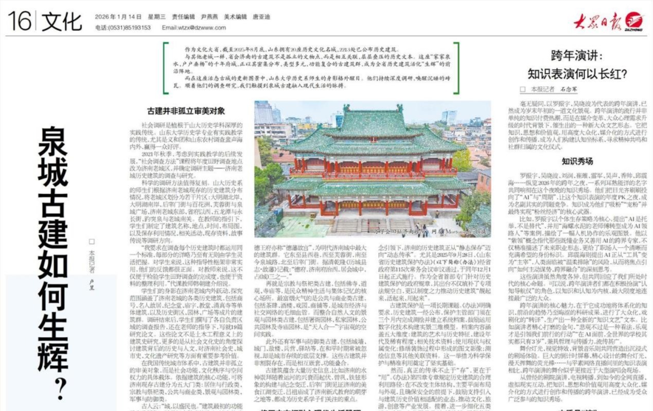2026年1月14日《大眾日報》刊登了《泉城古建如何生輝?》一文,詳細(xì)介紹了歷史學(xué)院師生開展的濟(jì)南老城歷史建筑的調(diào)查活動和相關(guān)成果。該項調(diào)查是2020級歷史學(xué)專業(yè)與歷史強(qiáng)基班本科生歷時兩年開展的,指導(dǎo)教師韓朝建、譚景玉等將學(xué)生們形成的7篇調(diào)查報告和19篇相關(guān)論文編輯成書,于近期正式出版并受到各界好評,為歷史學(xué)院本科實(shí)踐教學(xué)再添新成果。《大眾日報》報道詳細(xì)介紹了該項調(diào)查的基本情況和研究成果,指出濟(jì)南是山東全省...